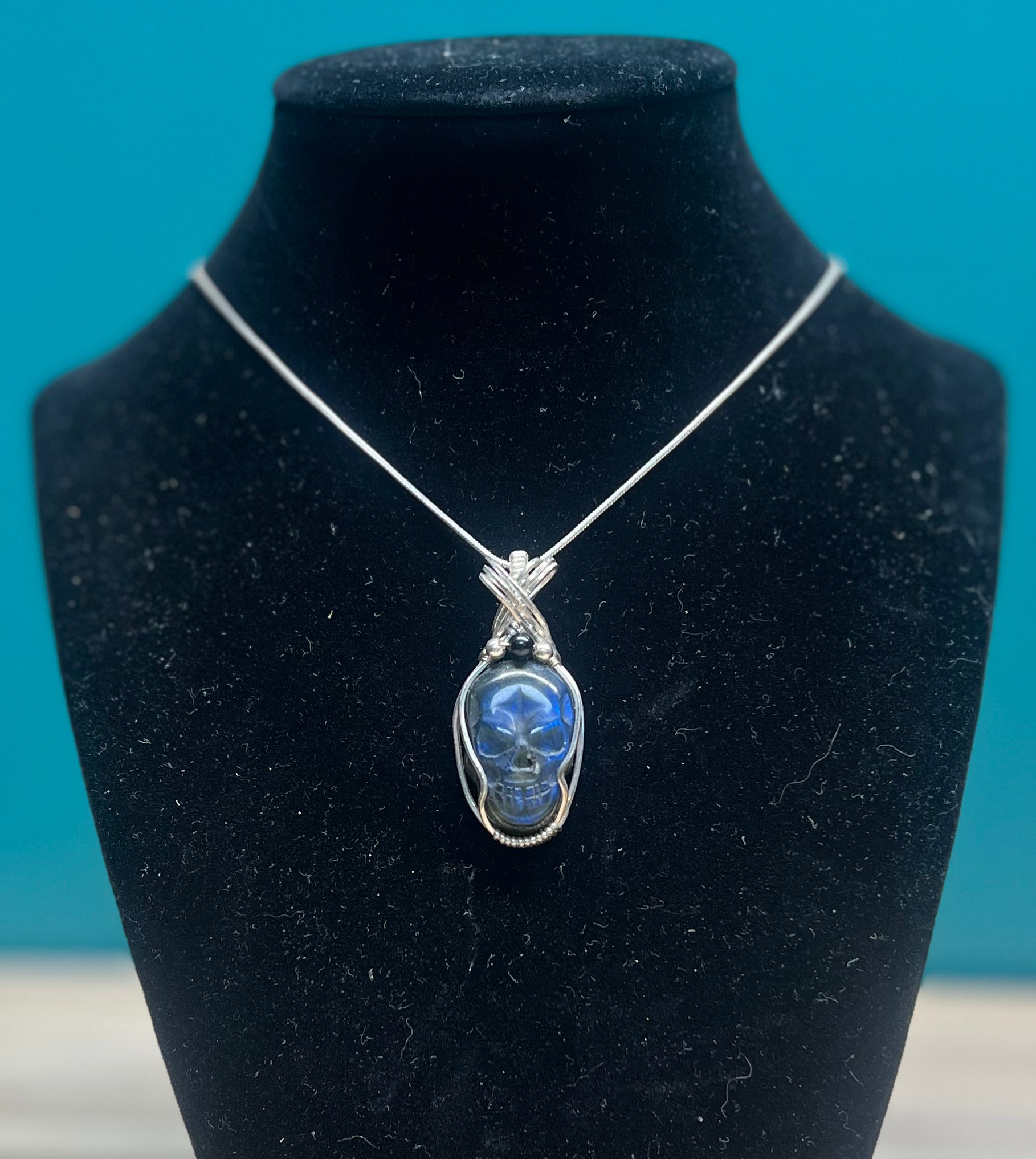 Get ready to add some unique and playful flair to your jewelry collection with our Blue Labradorite Skull Necklace! This statement piece features flashy blue labradorite and is wrapped in sterling silver wire. A fun and quirky addition to any outfit.