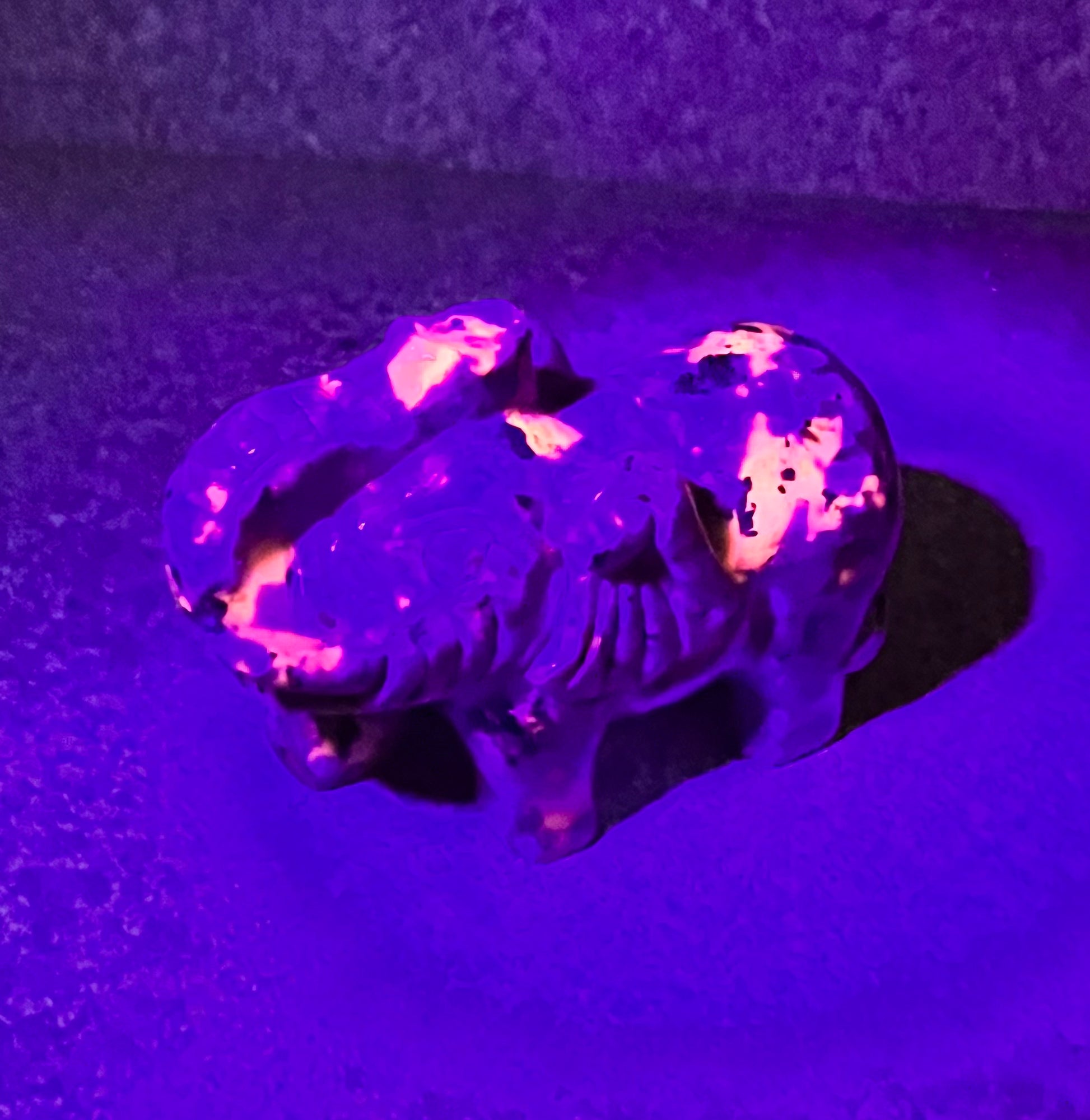 Experience the magic of Yooperlite, a UV reactive mineral found only in the Upper Peninsula of Michigan. Let the vibrant colors light up your world and spark your sense of wonder. Elephant, a true gem for collectors and nature enthusiasts alike. Measuring 3” from trunk to tail.